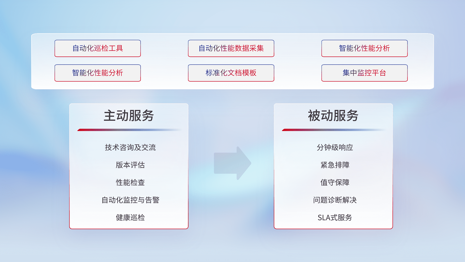 智能化工具和标准化文档,,,保障服务质量,,,提供主动服务(包含技术咨询、、、、版本评估、、、性能检查、、、、自动化监控与告警、、、健康巡检)和被动服务包含(分钟级响应、、、、紧急排障、、、值守保障、、、问题诊断解决、、、、SLA服务)。。。。