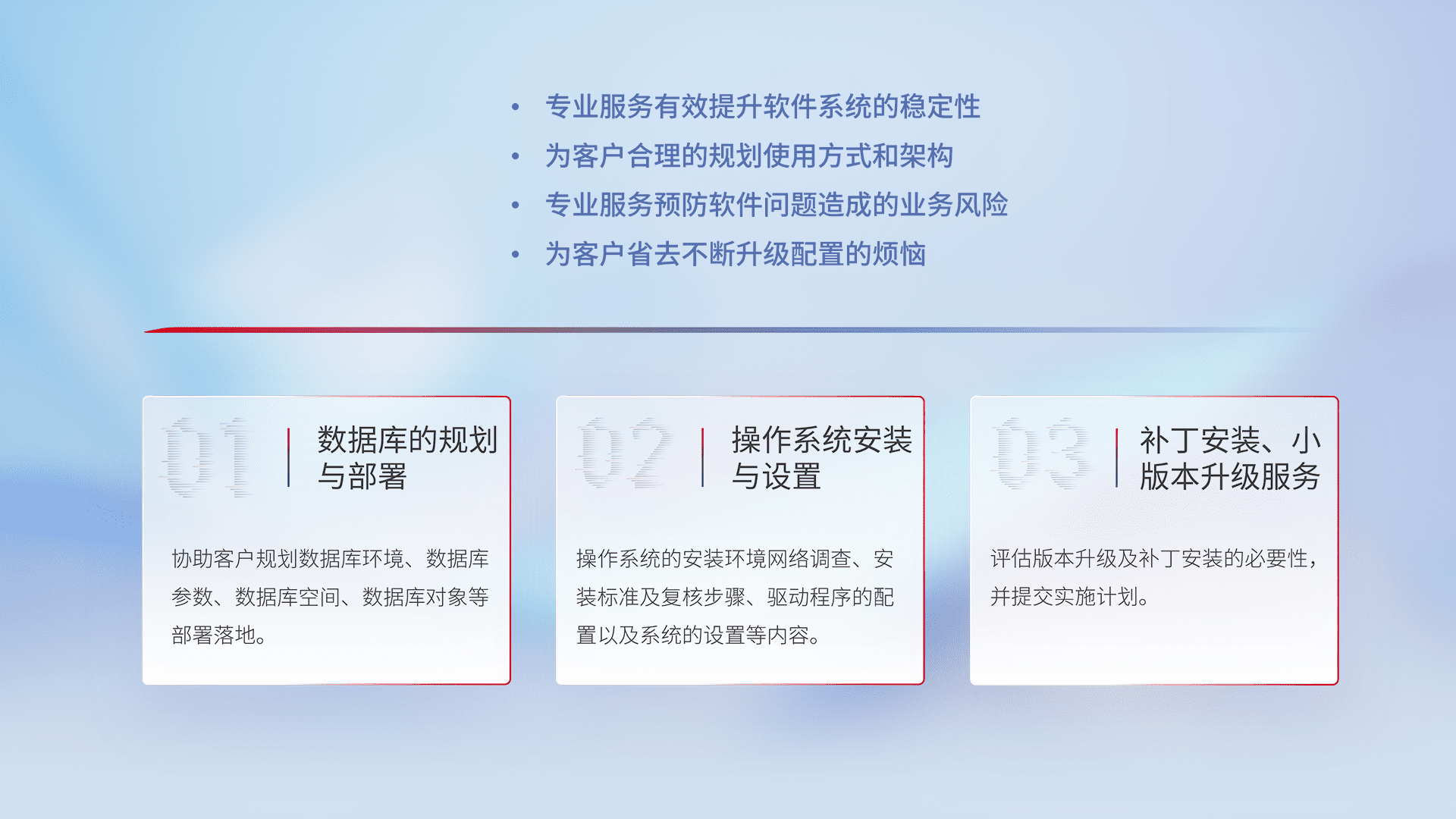 为客户提供软件规模升级、、、快速部署、、按需配置的专业服务,,从数据库的规划与部署到操作系统的安装与设置,,再到补丁安装和小版本升级提供支持。。。